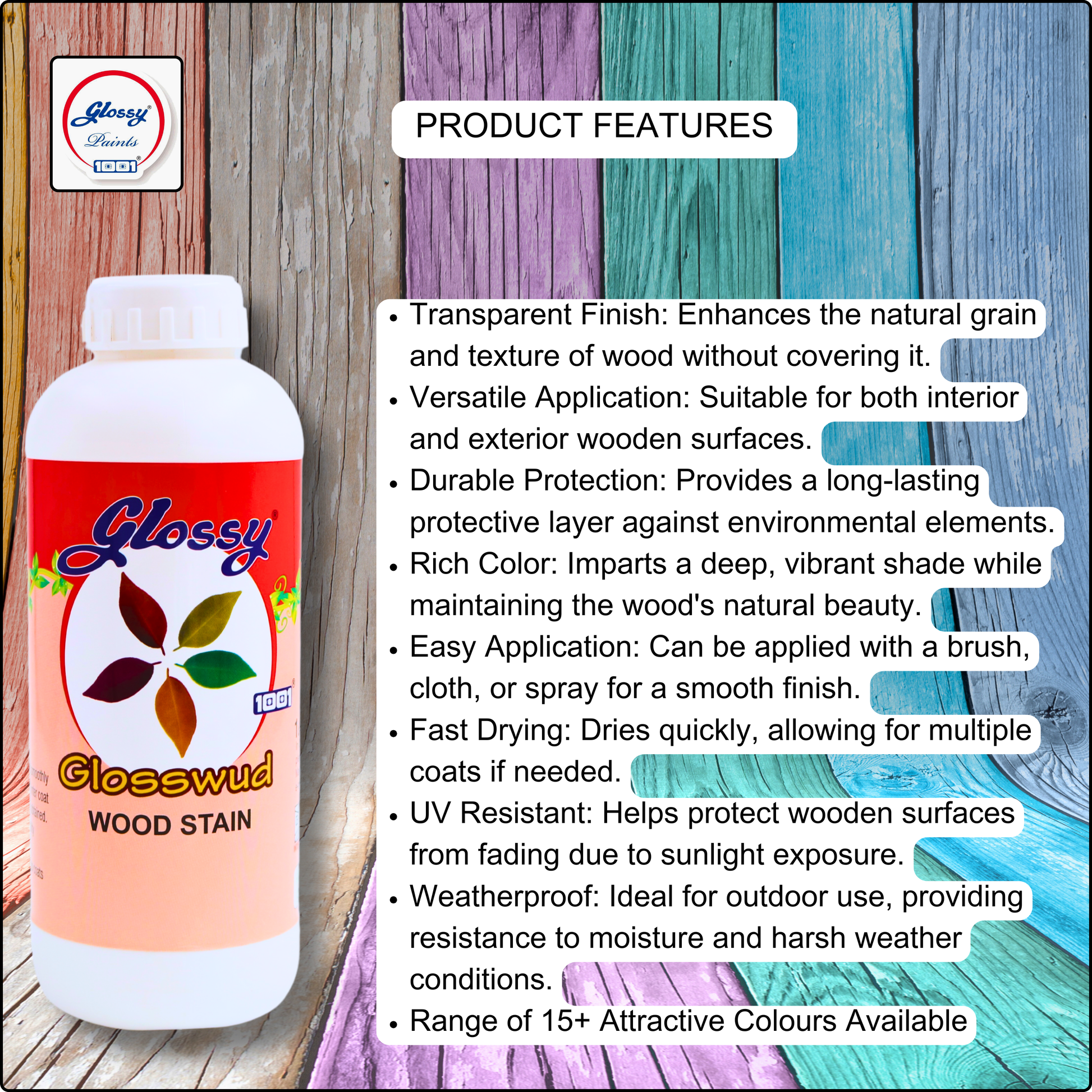 1001 Glosswud Wood Stains deliver rich, penetrating color that enhances natural wood grain while providing durable protection. Formulated with premium resins and pigments, these stains offer superior adhesion and fade resistance for interior and exterior applications. Available in a curated palette of warm and cool tones, each shade is engineered to showcase wood character without obscuring detail. Fast-drying and low-odor, Glosswud stains are ideal for furniture refinishing, decking, and architectural woodwork where depth and longevity matter.